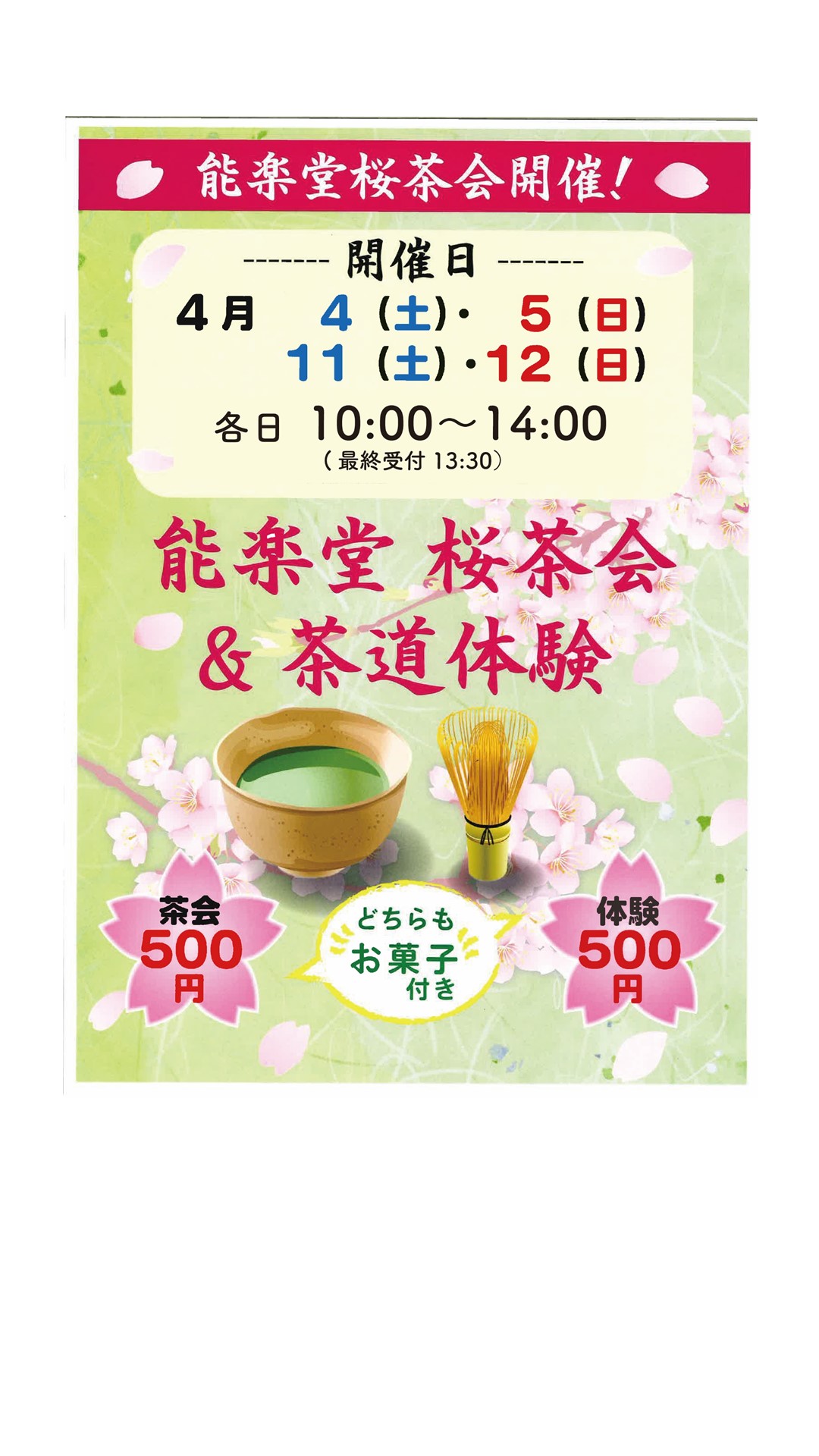 、「お菓子付 平 500円 和 (税込) 桜 市 民 公 園 茶 能 楽 堂 茶・ 4/45月 ਵই 숯 4/4 5日 道 体 11± 12日 11+12日 日 我 & 験 10:00~14:00 10:00 14:00 ※最終受付 13:30」というテキストの画像のようです